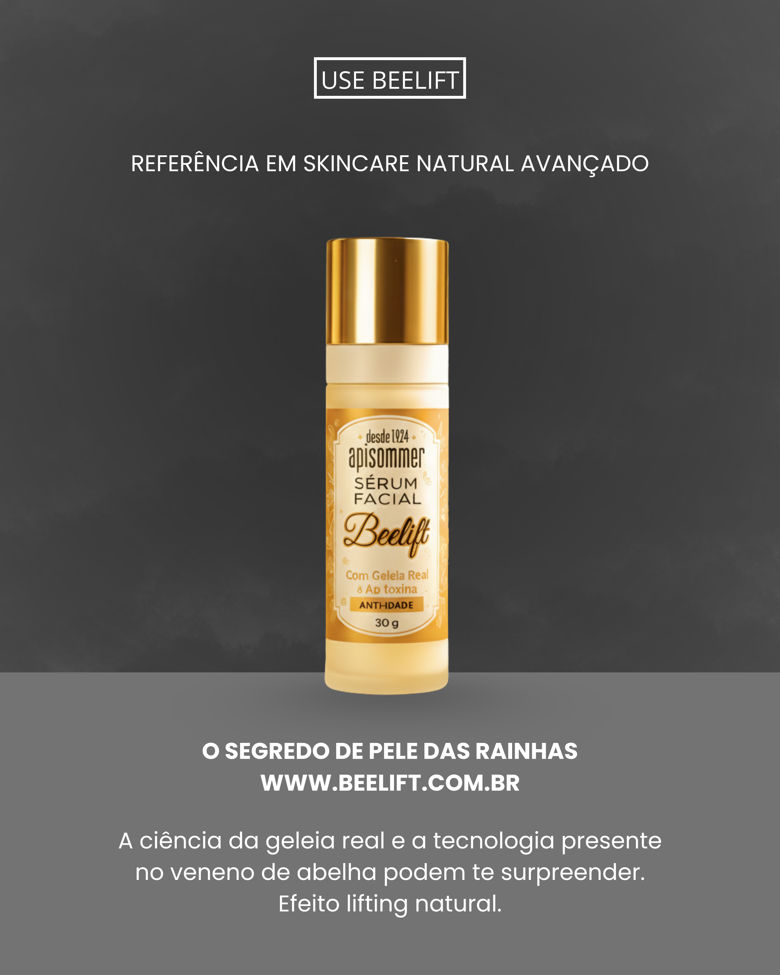 O Beelift é um creme facial premium desenvolvido com geleia real, ácido hialurônico, vitamina C e apitoxina, um ativo natural derivado do veneno das abelhas que estimula o rejuvenescimento e promove um efeito lifting natural na pele.